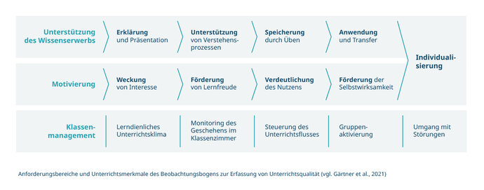 Dem Beobachtungsinstrument liegt ein theoretisches Unterrichtsmodell zugrunde, dass zwischen drei übergeordneten unterrichtlichen Anforderungsbereichen unterscheidet. Zu den zentralen Anforderungen von Lehrkräften können demnach die (1) Unterstützung des Wissenserwerbs, (2) die Motivierung von Schüler und Schülerinnen sowie das (3) Klassenmanagement gezählt werden. Jeder Anforderungsbereich ist in mehrere Unterrichtsmerkmale ausdifferenziert, die der aufgeführten Tabelle entnommen werden können.