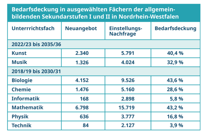 Besonders problematisch ist der Lehrkräftemangel in den MINT- und kreativen Fächern. Eine detaillierte Analyse von Klemm (2021, 2024) zeigt, dass in den Jahren 2022 bis 2035 allein in Nordrhein-Westfalen nur 40,4 Prozent der benötigten Kunstlehrkräfte und 32,9 Prozent der Musiklehrkräfte verfügbar sein werden. In den MINT-Fächern ist die Situation ähnlich besorgniserregend: Von 2018 bis 2031 könnten je nach Fach nur zwischen 39 Prozent (Technik) und 43,6 Prozent (Biologie) der notwendigen Lehrkräfte gestellt werden.
