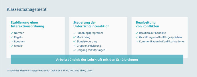 Neben der kognitiven Aktivierung und der konstruktiven Unterstützung von Schüler:innen zählt Klassenmanagement zu den drei zentralen Basisdimensionen der Unterrichtsqualität. Während kognitive Aktivierung und konstruktive Unterstützung sich unmittelbar auf die kognitiven und motivationalen Prozesse des Lernens beziehen, geht es beim Klassenmanagement um die Gestaltung und Steuerung der Interaktion im Klassenzimmer. Die Herausforderung für Lehrkräfte besteht darin, die unterschiedlichen Handlungen und Handlungsimpulse der Schüler:innen so zu koordinieren, dass Störungen des Unterrichts minimiert und die aktive Lernzeit möglichst aller Schüler:innen maximiert wird.